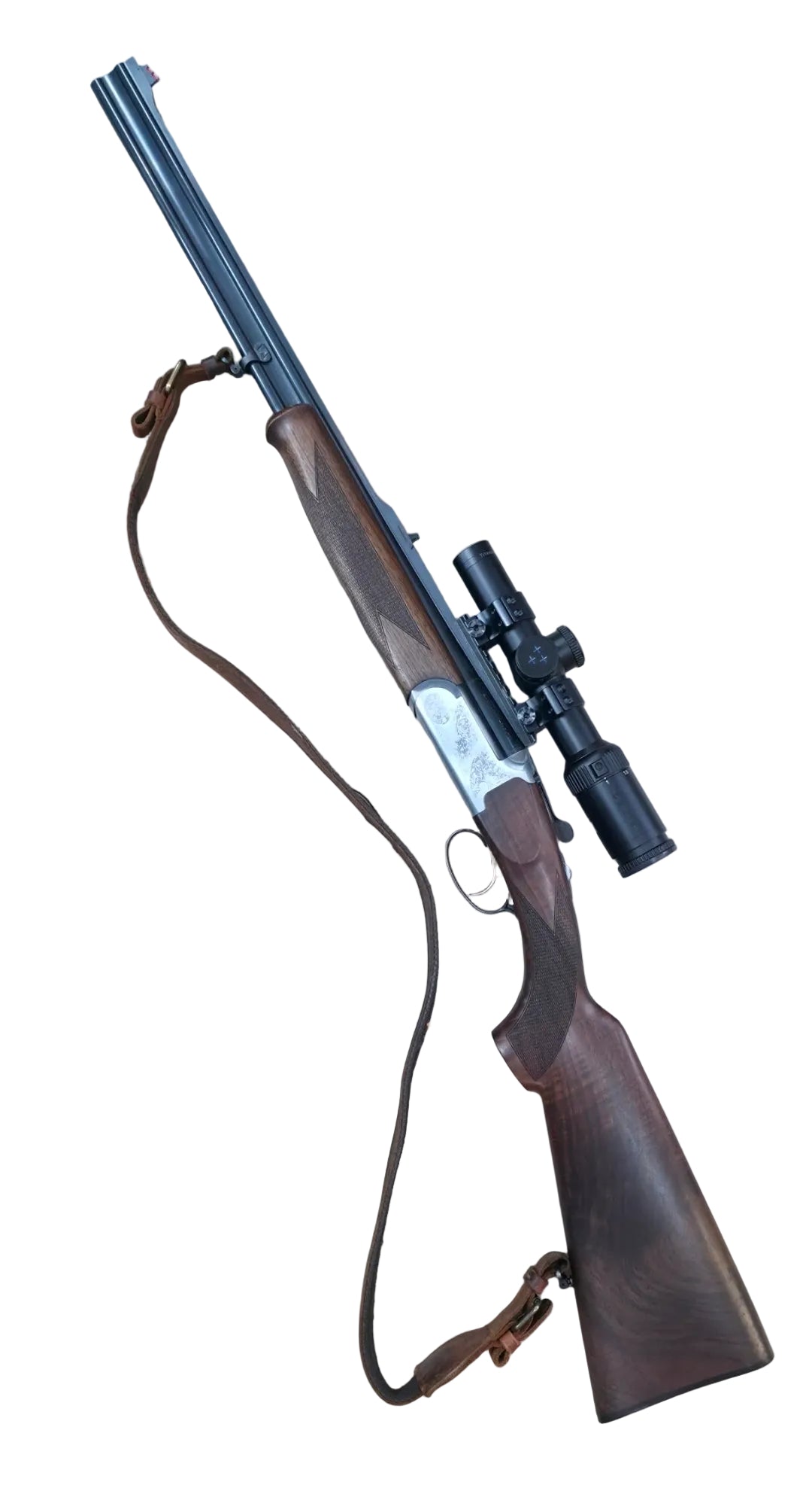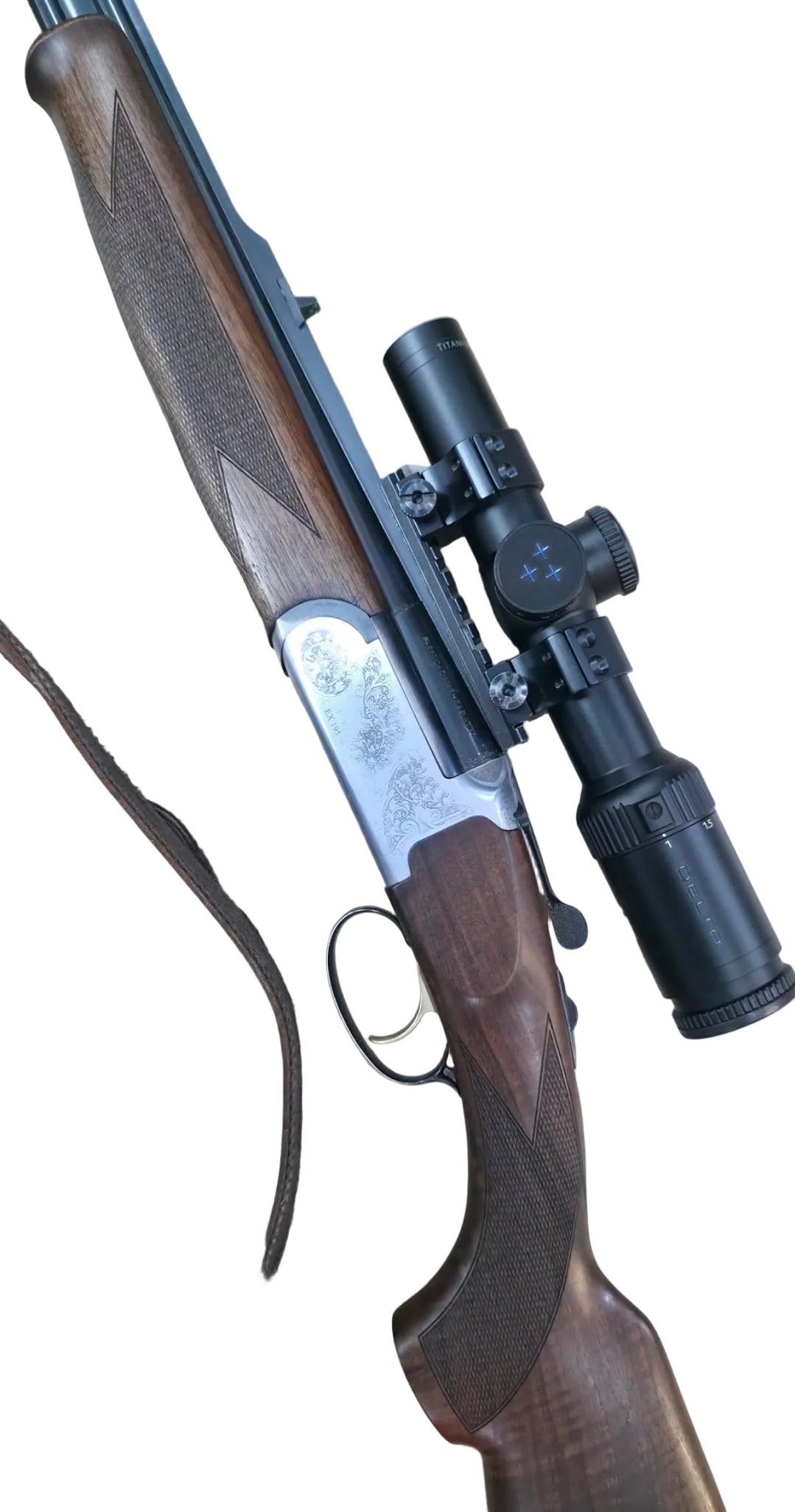 Nous proposons ici un ensemble de chasse complet, cohérent et immédiatement opérationnel, composé d’une carabine double express Sabatti Modèle 195 en calibre 8×57 JRS, équipée d’une lunette Delta Titanium HD 1-6×24 montée sur embases Picatinny Recknagel avec colliers Sport Match, livré avec brettelle cuir et deux boîtes de cartouches.